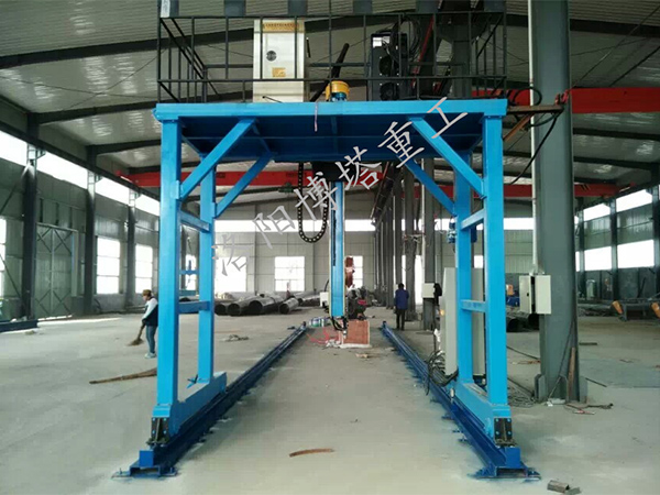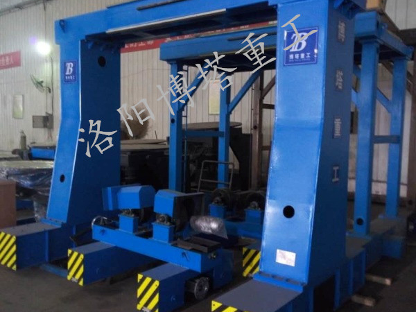 龍門架是本機(jī)的骨架部分,各部分均安裝于龍門架上,龍門架主要起支持各部分并帶動(dòng)各部分以焊接速度行走的作用,其下部為兩個(gè)行走梁,由兩臺(tái)交流低速電機(jī)帶動(dòng)龍門架在鋼軌上行走,另有兩對(duì)靠輪緊靠鋼軌兩側(cè)面,保證行走平穩(wěn),操作平臺(tái)設(shè)于龍門架中間位置,龍門架上平臺(tái)安裝了掛絲架及焊劑回收機(jī)等裝置。